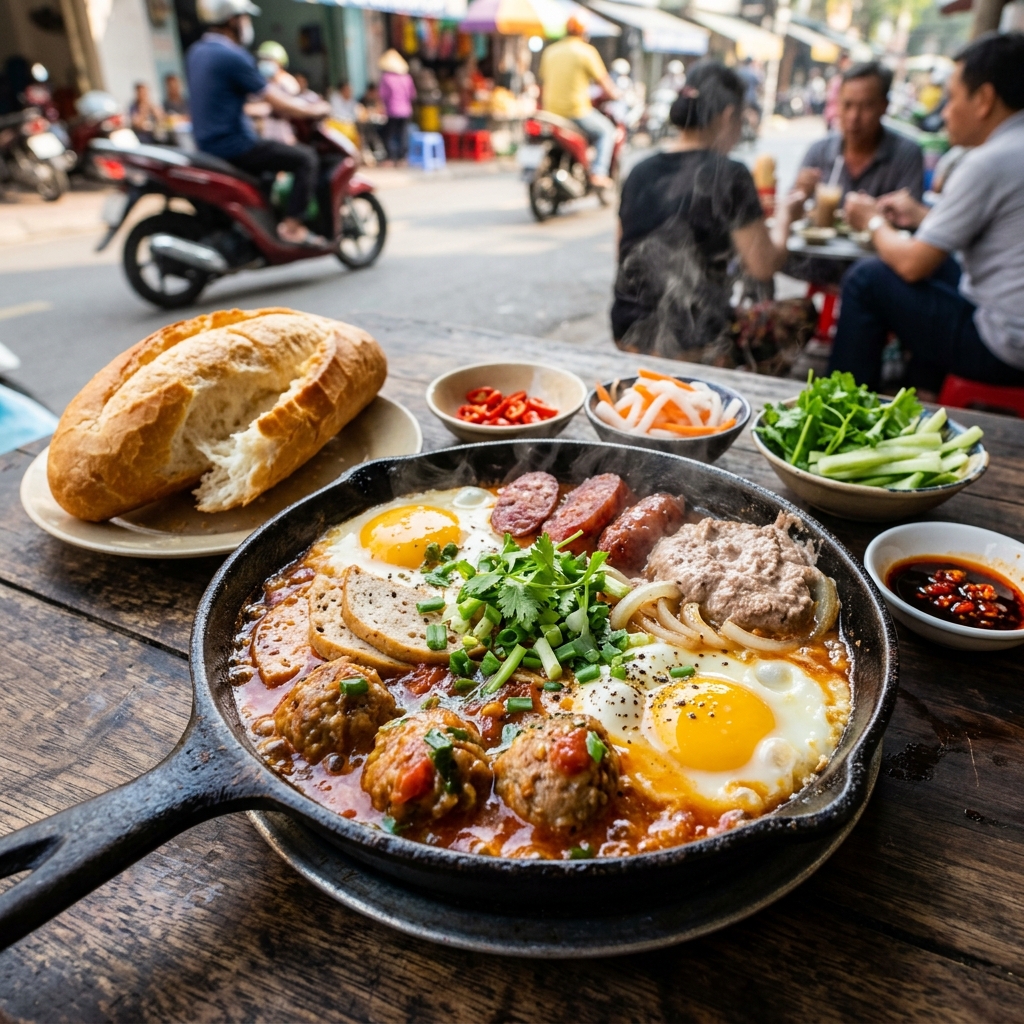 Bánh mì chảo – bữa sáng vui mắt vui miệng. Trứng ốp la, xúc xích, pate, xíu mại được phục vụ trên chiếc chảo gang nóng hổi cùng sốt cà chua đậm vị, ăn kèm với bánh mì nướng giòn.