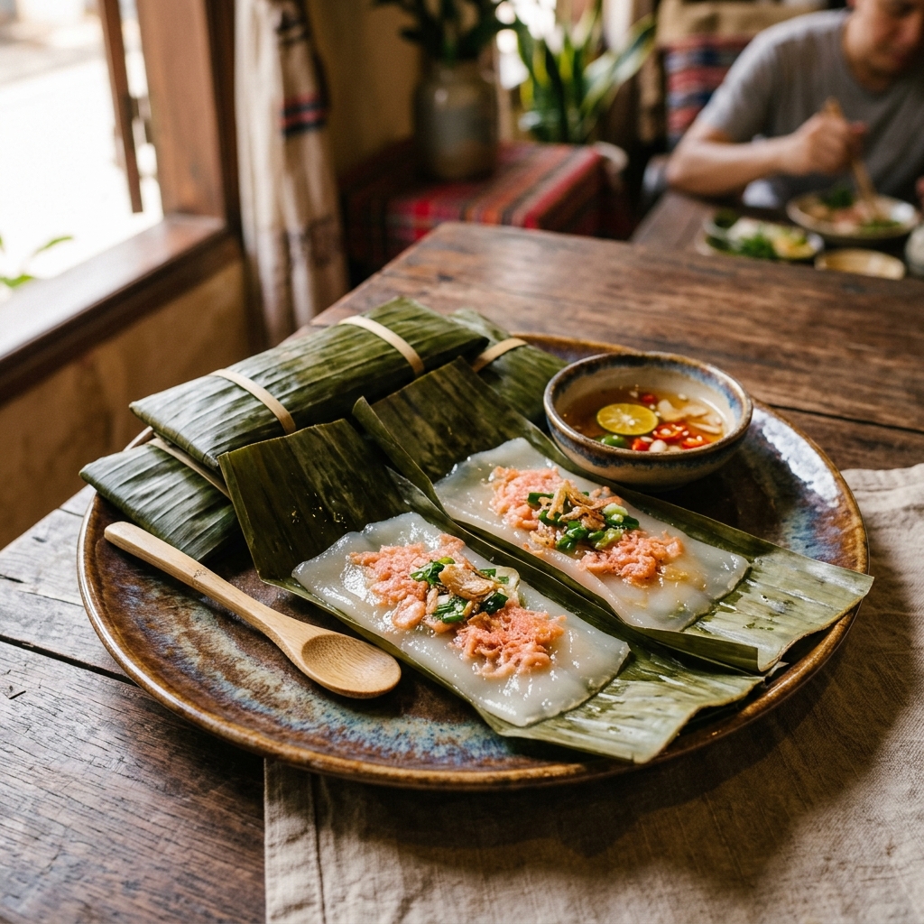 Bánh nậm Huế – lớp bột gạo mỏng mềm thanh nhã, nhân tôm chấy hồng đào, gói lá chuối phẳng phiu, chấm mắm ớt.