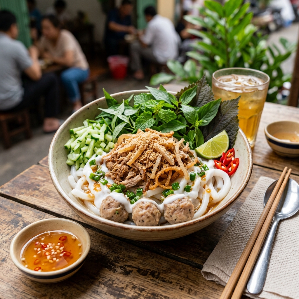 Bánh tầm bì – sợi bánh tầm dẻo mềm trắng ngà, bì heo giòn sần sật, nước cốt dừa béo, xíu mại thơm.