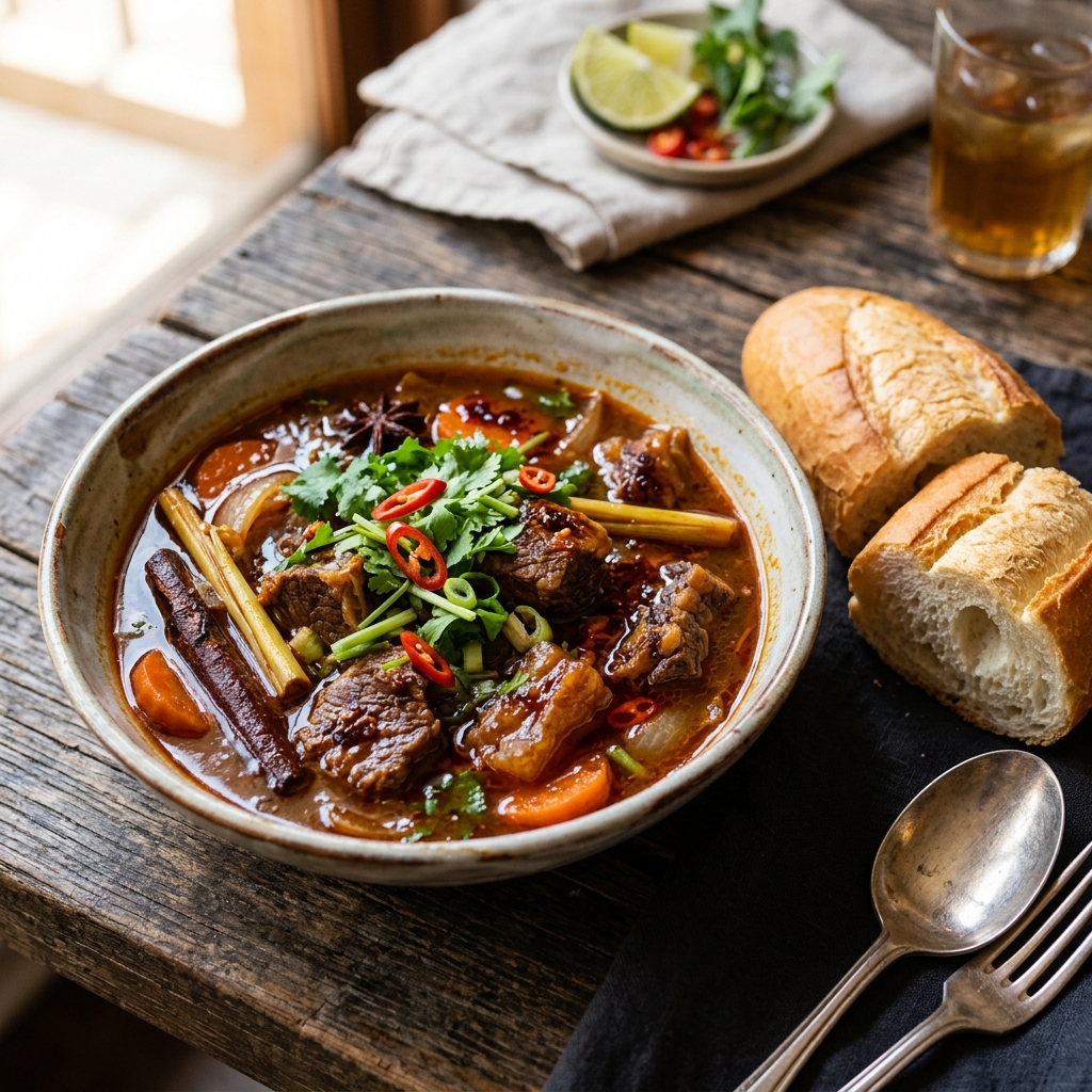 - Nêm nếm và dọn ăn: Nếm thử nồi kho, thêm nước mắm và đường cho vừa khẩu vị. Nước kho đạt chuẩn phải sánh sệt vừa phải, bám nhẹ vào muỗng khi múc lên. Dọn ra tô sâu lòng, rắc hành lá và ngò rí xanh tươi lên trên. Ăn ngay với bánh mì giòn nóng — xé đôi ổ rồi nhúng thẳng vào nồi mới đúng kiểu Sài Gòn. Mẹo: Bò kho ngày hôm sau ăn ngon hơn ngày mới nấu, vì chờ qua một đêm gia vị mới ngấm hết vào từng thớ thịt. Hâm lại bằng lửa nhỏ, cho thêm chút nước nếu nước kho bị cạn.