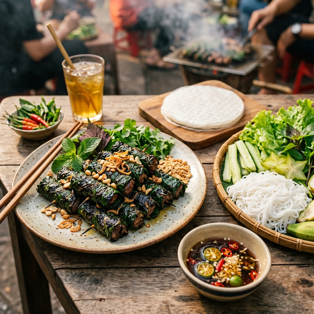 - Thưởng thức: Ăn nóng kèm bún tươi, rau sống, đồ chua. Chấm muối tiêu chanh hoặc mắm nêm. Mẹo: Cuốn bún + rau + bò lá lốt trong bánh tráng — ngon tuyệt!