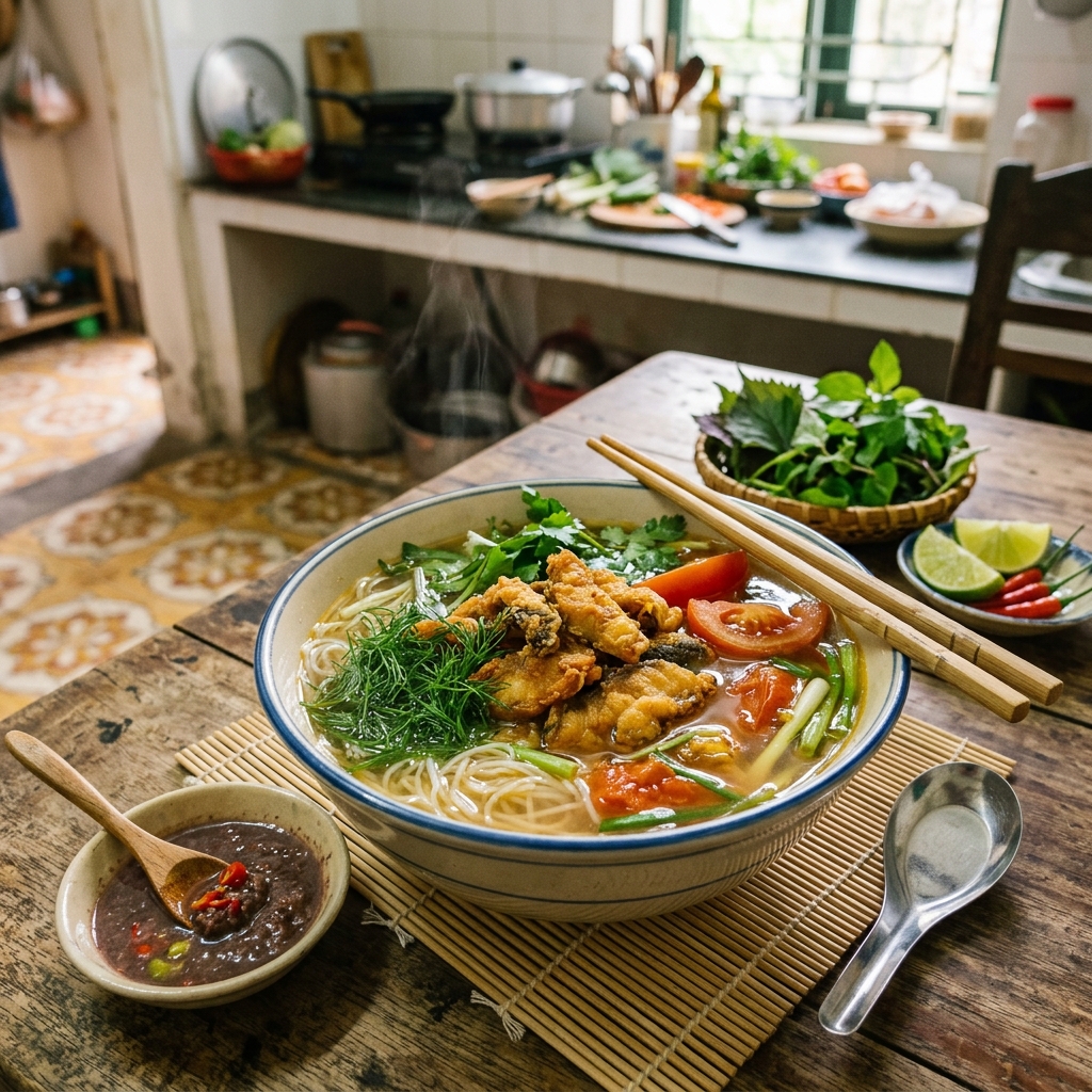 - Chan bún và thưởng thức: Cho bún tươi ra tô. Chan nước dùng cà chua hành thì là nóng hổi lên trên. Xếp miếng cá rô chiên vàng vào. Ăn kèm mắm tôm pha chanh tỏi ớt là chuẩn nhất vị Bắc. Mẹo: Mắm tôm là không thể thiếu — chấm miếng cá vào mắm tôm trước khi ăn với bún