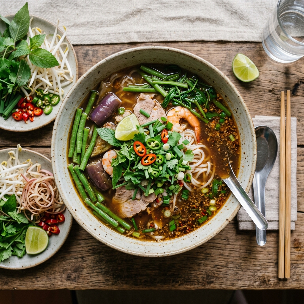 Bún mắm Cần Thơ – nước dùng mắm cá sặc đậm đà, heo quay giòn, tôm cá tươi ngọt, rau miền Tây xanh mướt.
