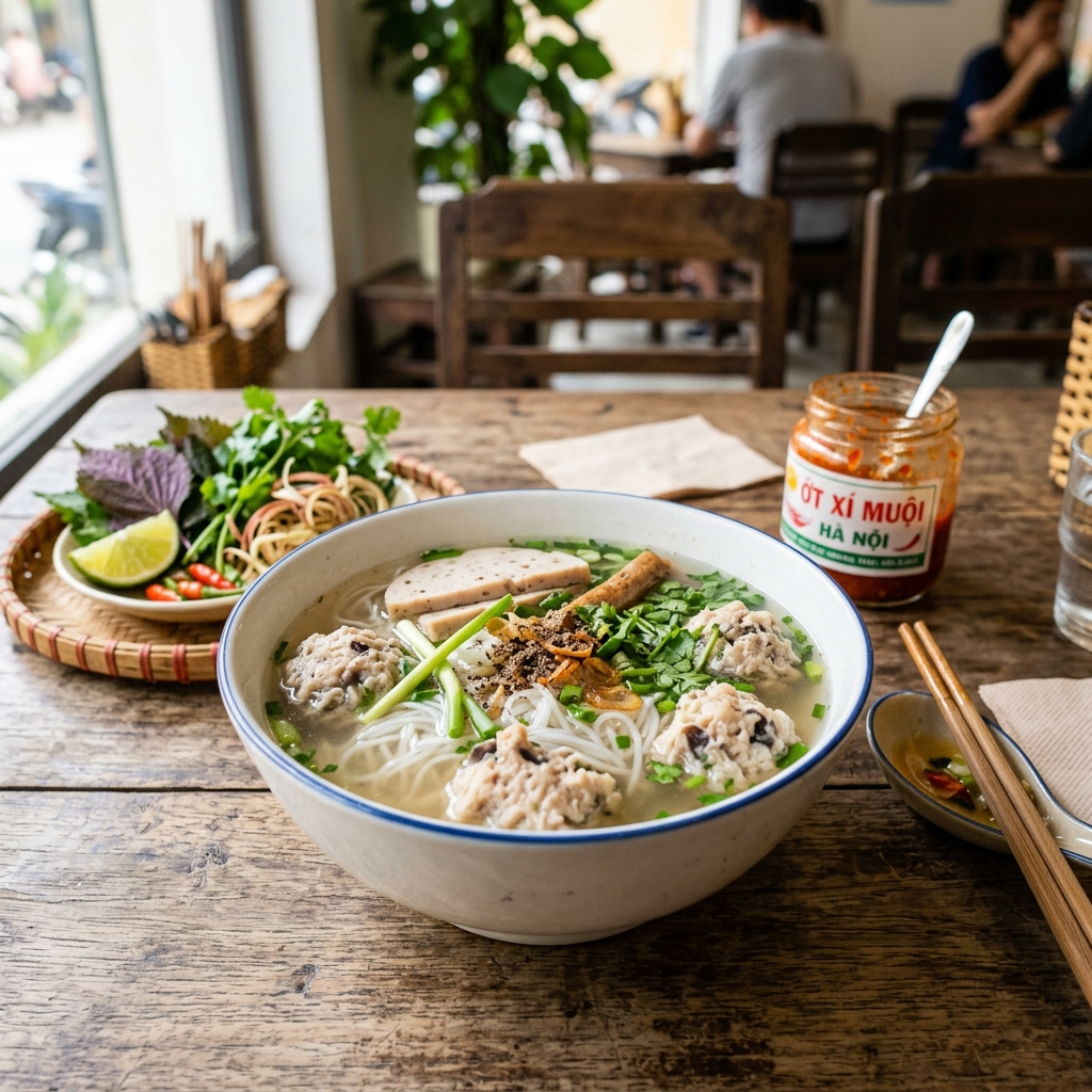 - Bày tô: Bún trụng nóng vào tô. Chan nước dùng, xếp viên mọc. Rắc hành lá, rau mùi, tiêu. Mẹo: Ăn kèm quẩy (giò cháo quẩy) — kiểu ăn sáng Hà Nội.