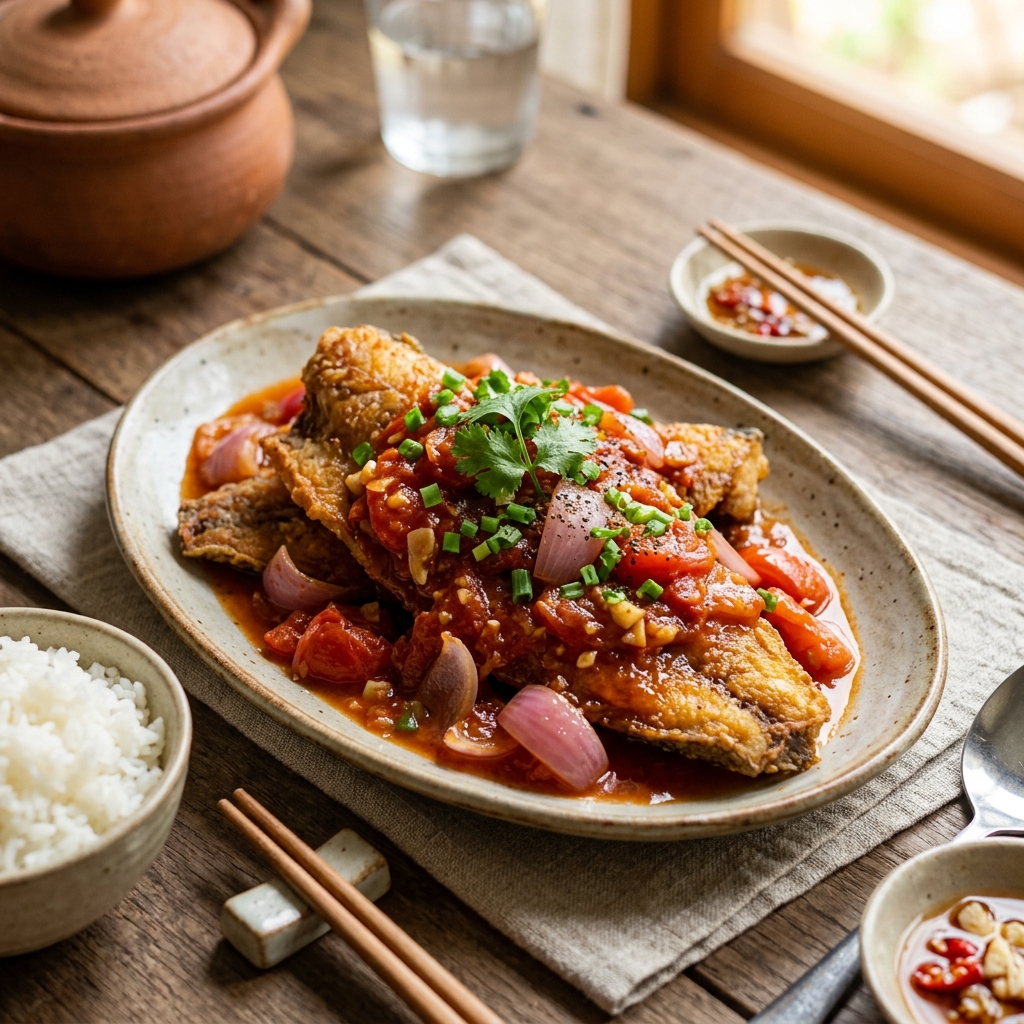 - Hoàn thành: Cá chiên xếp đĩa, chan sốt cà chua lên. Rắc hành lá. Ăn nóng với cơm trắng. Mẹo: Chan sốt lên cá ngay trước ăn — cá giòn + sốt sánh là hoàn hảo.