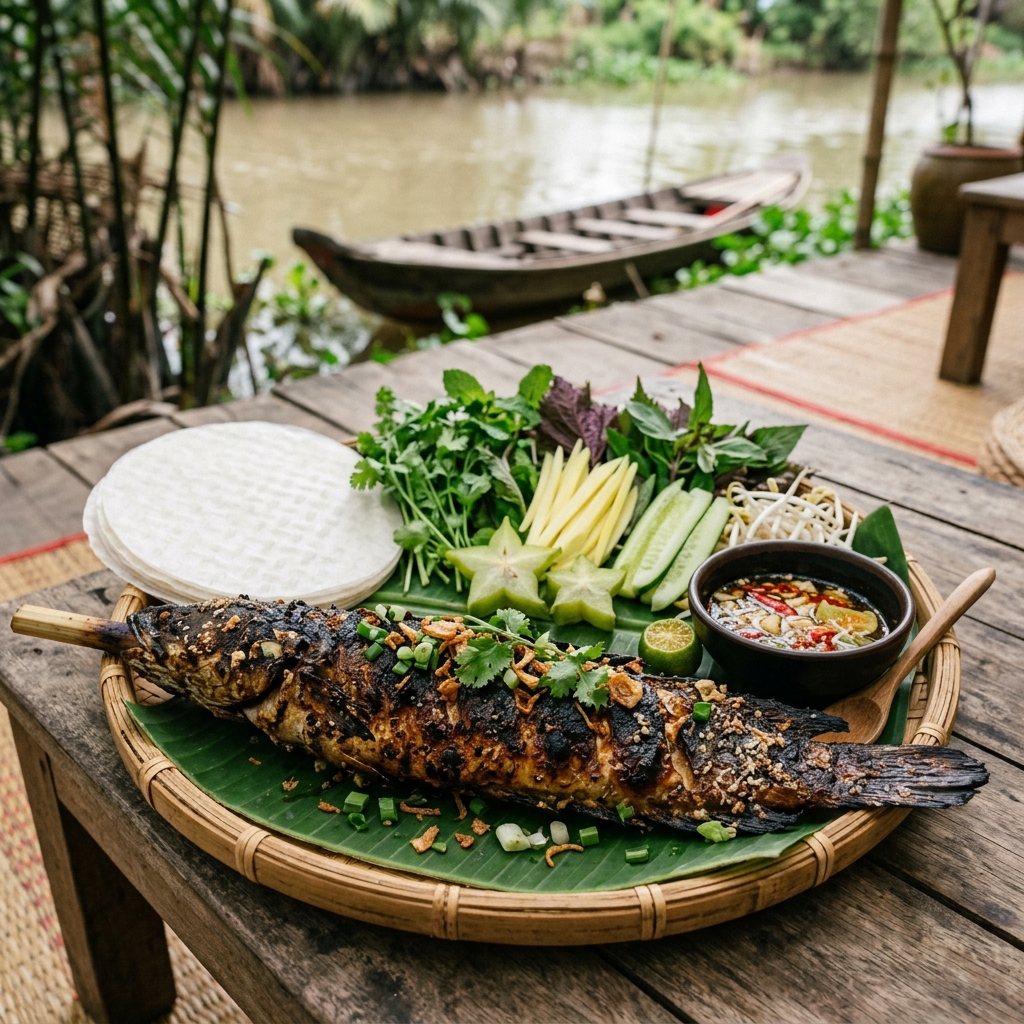 Cá lóc nướng trui – cá lóc đồng cắm que nướng rơm vàng ươm, da giòn thịt ngọt, cuốn bánh tráng rau sống chấm mắm nêm.