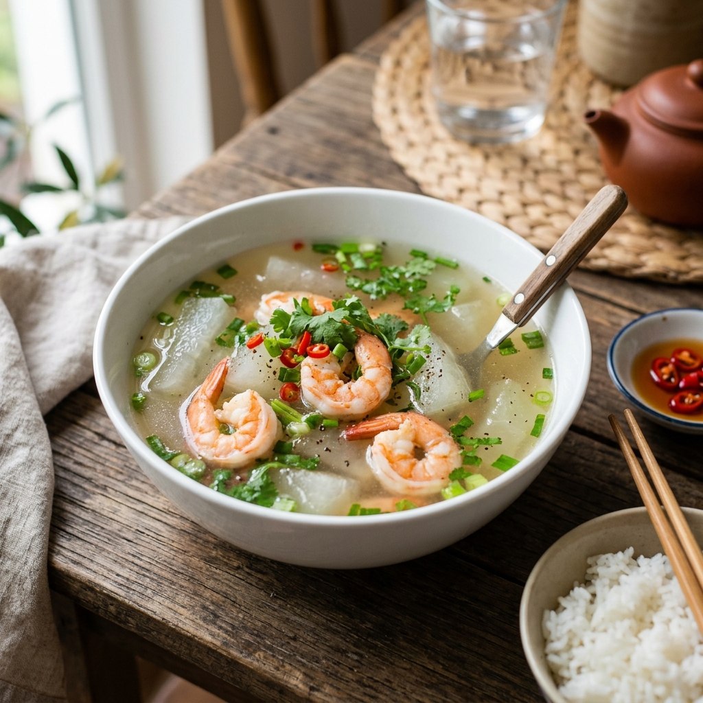 Canh bí đao tôm – bí đao trắng mềm ngọt thanh, tôm tươi ngọt thịt, canh trong nhẹ nhàng giải nhiệt mùa hè.
