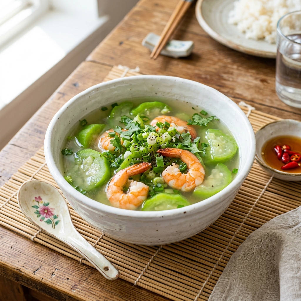 - Hoàn thành: Tắt bếp, rắc hành lá cắt nhỏ. Ăn nóng cùng cơm trắng. Mẹo: Canh mướp tôm đơn giản nhưng ngọt thanh — món canh bữa cơm hoàn hảo.