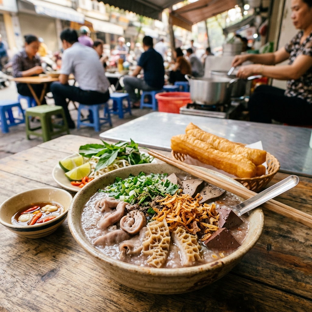 Cháo lòng – cháo trắng mịn nhuyễn, lòng heo sạch giòn sần sật, tiết heo mềm, hành lá tiêu thơm, bữa sáng dân dã.