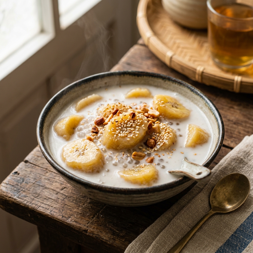 - Hoàn thành: Tắt bếp, múc ra chén. Rắc đậu phộng rang, vừng, dừa nạo. Ăn nóng hoặc lạnh đều ngon. Mẹo: Chè chuối ăn ấm nóng ngon nhất — nước cốt dừa dậy mùi thơm hơn.