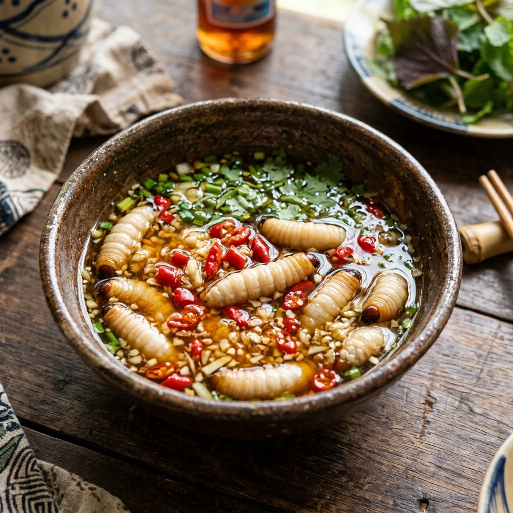 - Hồ xói nước mắm hiểm trù: Chuẩn bị bát mắm nhỉ xịn đục rót nạm đầy vớt, rắc dội bứt chùm ớt xắt viền ngập đục lò dò ngụp nước đục nâu sẫm tỏi cắt khứa mỏng ốp cay. Dùng đũa luồn xó thả rọt từn con đuông múp vào bát. Nó bị xót cay bơi quẩy co lộn tắm lõm trồi sụt cúc cắc bọc quanh vỏ lúp nhúp trong nước. Mẹo: Mắm phải độ đậm nhĩ chắt rặc mặn đớ lưỡi gắt cay mới gạt bù dc vị ngậy sệt.