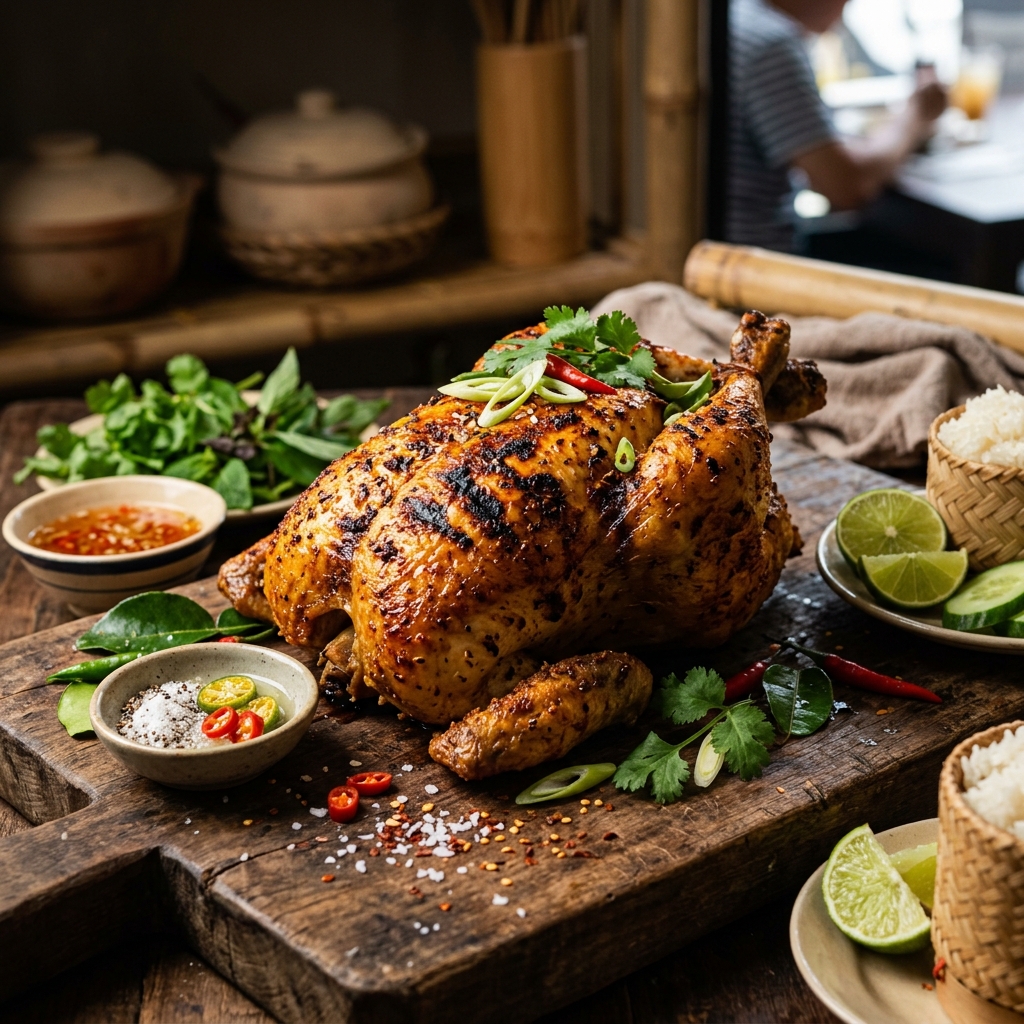 - Thưởng thức: Chặt gà miếng vừa. Ăn kèm muối tiêu chanh, rau sống, cơm trắng hoặc xôi. Mẹo: Muối tiêu chanh + gà nướng = combo hoàn hảo.