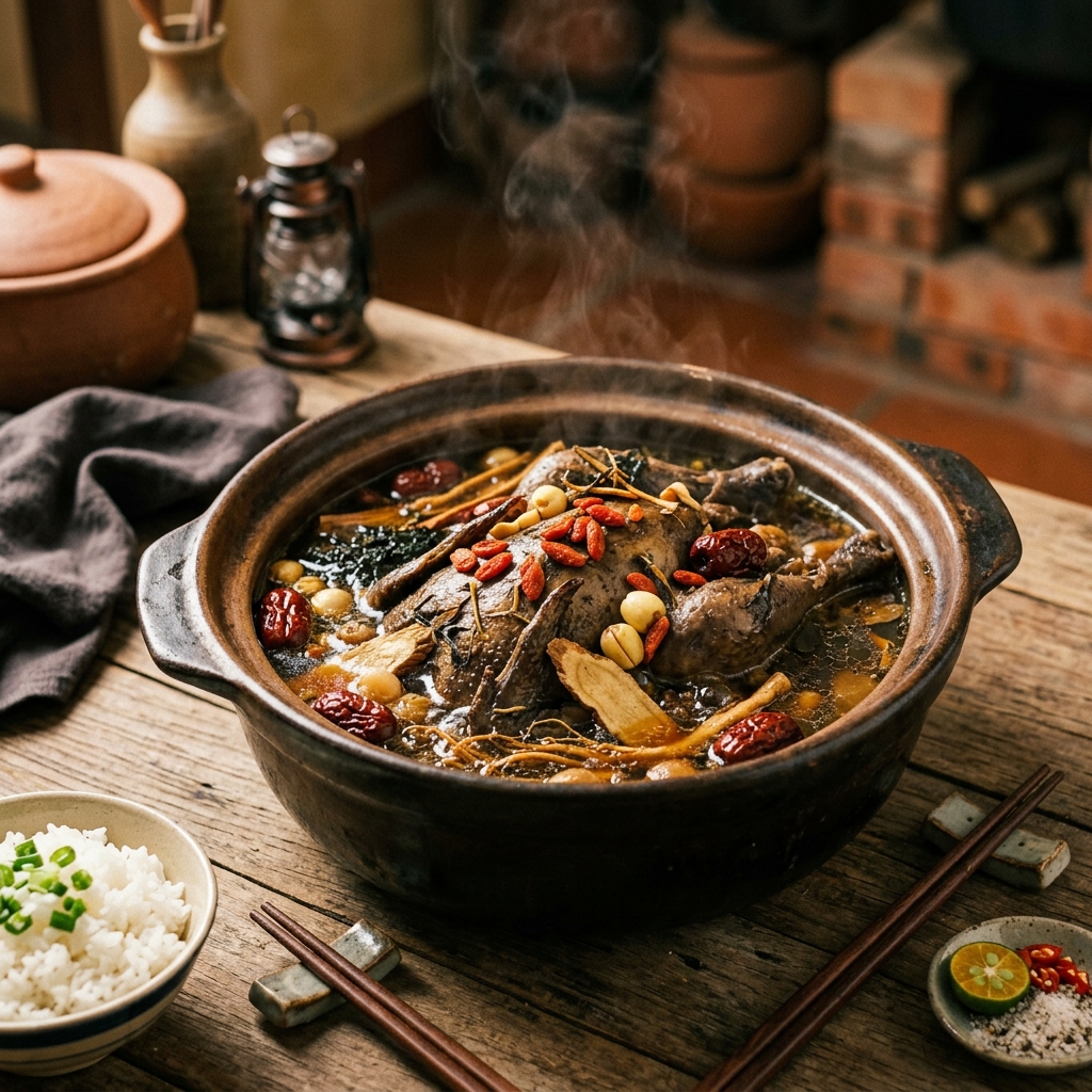 Gà tần thuốc bắc – gà ác hầm nhừ trong nước dùng thảo dược. Kỷ tử, táo đỏ, hạt sen, đương quy — bổ dưỡng ấm người.