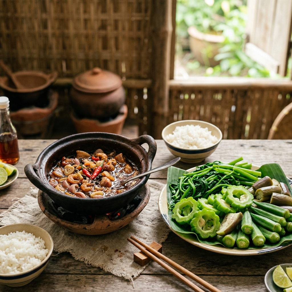 - Kho mắm: Phi tỏi thơm, xào thịt ba chỉ + tôm khô. Cho mắm cá + đường + 100ml nước. Kho lửa nhỏ 10 phút. Mẹo: Đường nhiều hơn bình thường — cân bằng vị mặn của mắm.