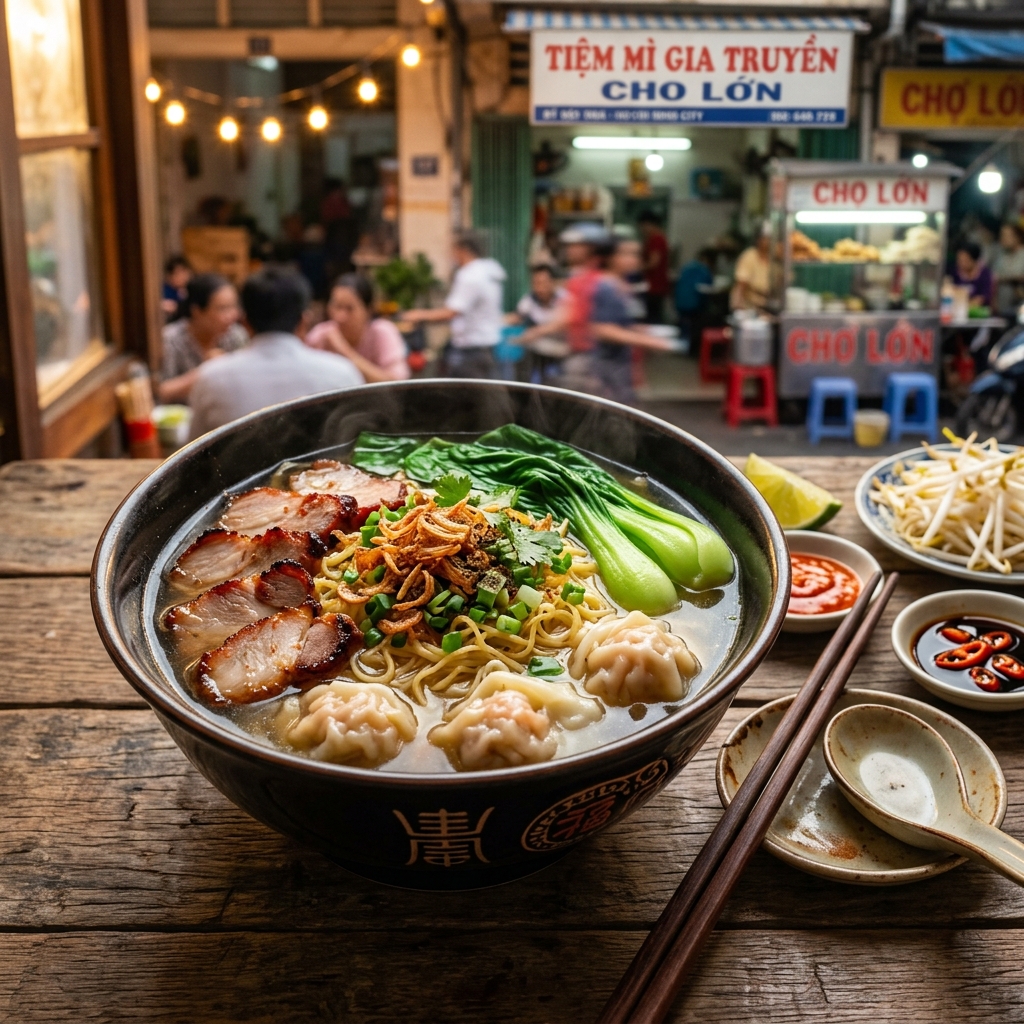 Mì hoành thánh – sợi mì trứng dai giòn, hoành thánh tôm thịt mỏng mềm, nước lèo trong ngọt kiểu người Hoa Chợ Lớn.