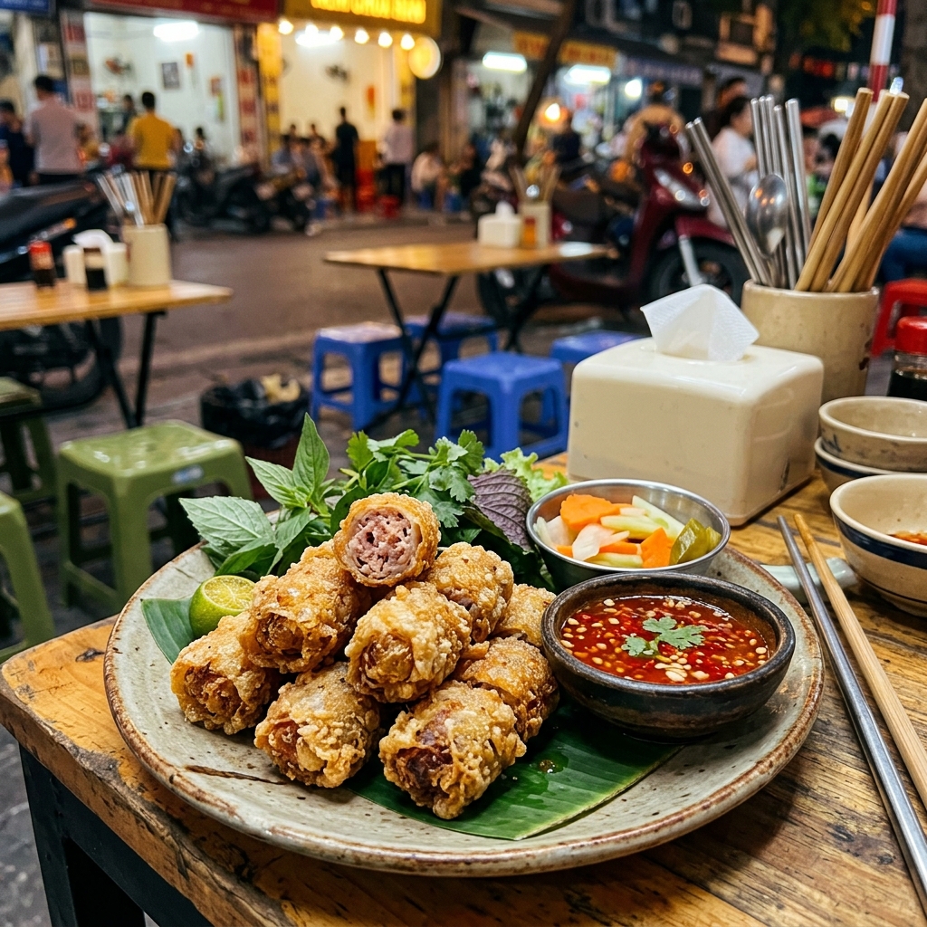 - Thưởng thức: Nem vớt ra giấy thấm dầu. Cắt xéo. Ăn nóng chấm tương ớt ngọt hoặc nước mắm chua ngọt. Mẹo: Ăn nóng giòn nhất — để nguội sẽ mềm mất ngon.