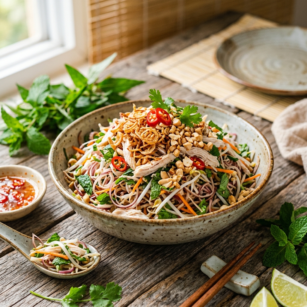 Nộm hoa chuối – hoa chuối thái mỏng giòn mát, trộn rau răm thơm, đậu phộng bùi, nước mắm chua ngọt dịu.