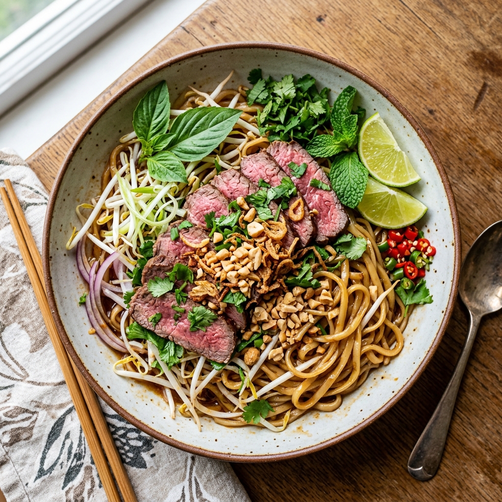 - Bày bát và hoàn thành: Xếp đều những lát bò tái hồng hào lên trên mặt bát phở. Rắc đậu phộng giã, hành phi giòn và ớt thái lát lên trên. Ăn ngay — trộn đều toàn bộ bát trước khi gắp để bò hòa quyện vào nước sốt. Mẹo: Phở trộn ngon nhất trong vòng 5-10 phút sau khi làm xong. Để lâu sợi phở sẽ mất độ dai và các topping bắt đầu mềm xuống. Nếu làm cho nhiều người, hãy trộn từng bát một thay vì trộn cả nồi.
