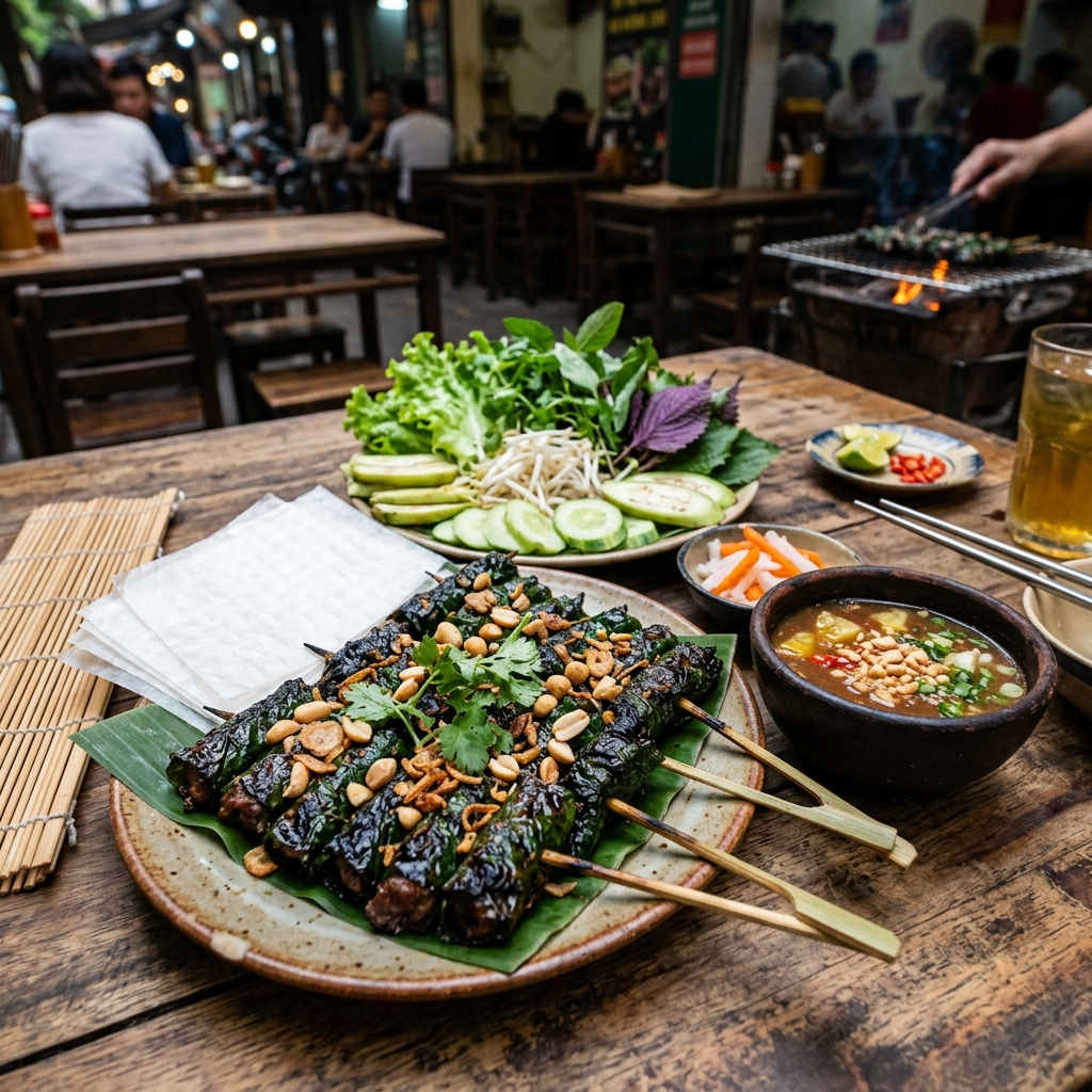 Thịt nướng lá lốt – thịt bò xay ướp gia vị cuốn lá lốt nướng than thơm nồng, ăn kèm bún rau sống mắm nêm.