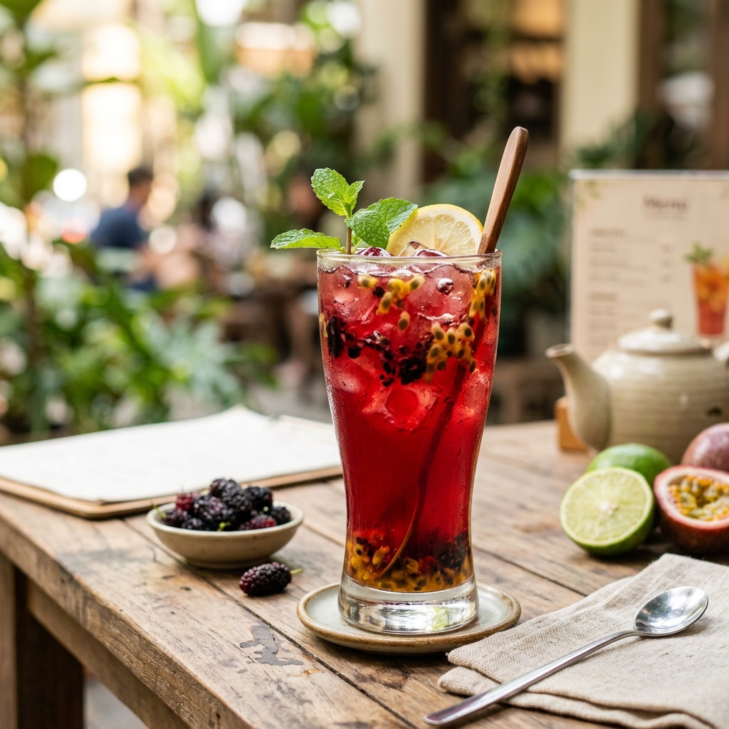 Nguyên liệu chính gồm: Trái dâu tằm chín mọng thẫm tứa, Chanh dây, Trà nhài / Hồng trà lọc đứt xột sệt đục bã, Đá viên lảo dòn bứt ngập, lá bạc hà non mọc. Xem chi tiết đầy đủ trong công thức bên dưới.