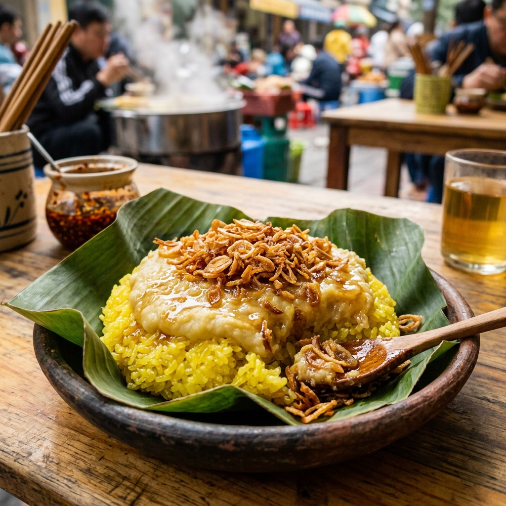 - Bày xôi xéo đúng điệu: Xới xôi ra tô hoặc gói lá sen. Xếp đậu xanh nghiền lên mặt xôi. Chan mỡ nước nóng lên trên. Rắc hành phi giòn. Xôi xéo Hà Nội ăn nóng ngay hoặc bọc lá chuối mang theo. Mẹo: Chan mỡ nước nóng lên xôi vừa xới — mỡ thấm vào xôi làm xôi bóng đẹp và béo thơm.
